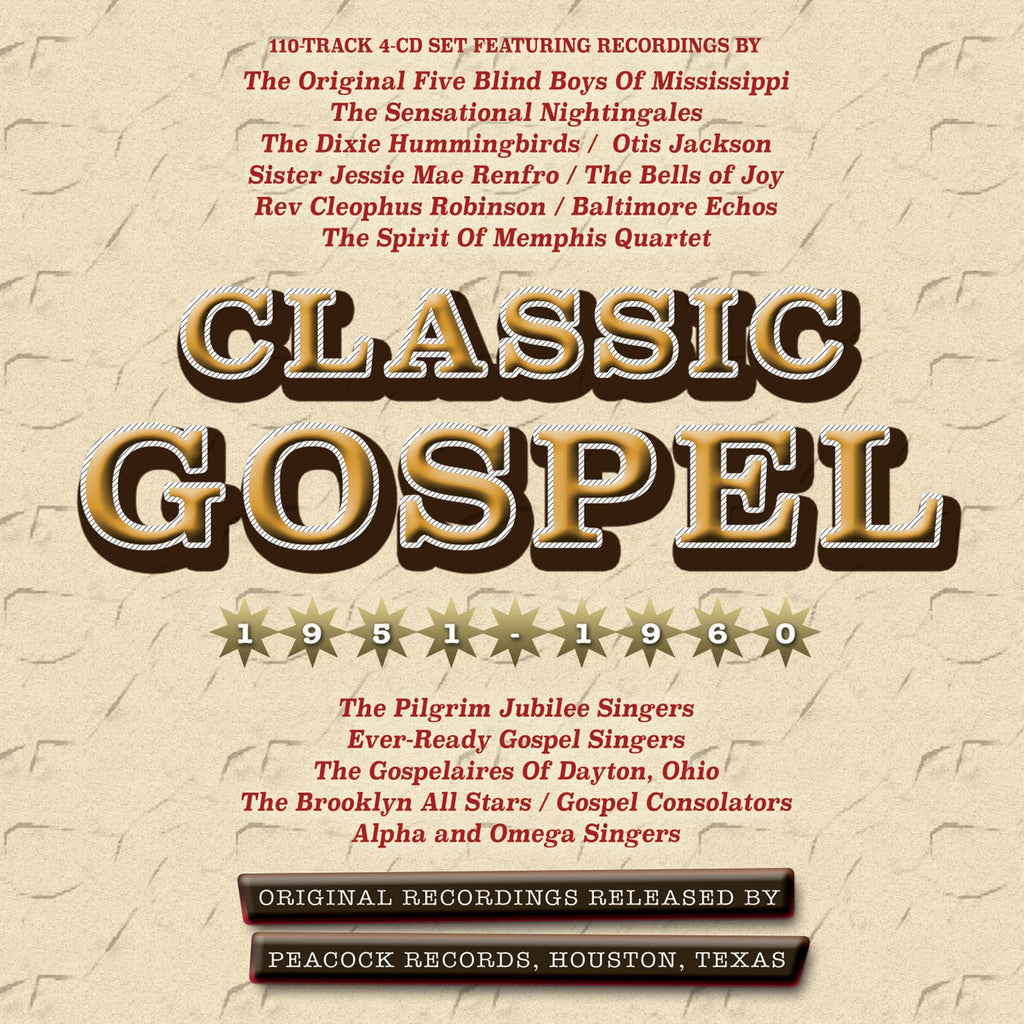 Acrobat has a significant catalogue of gospel recordings, and this addition to those offerings enables to make available recordings by some artists for whom we do not individual collections at this stage. It comprises material released on the celebrated Peacock label of Houston, Texas, which was a significant regional focus for the recording activity of some of the important and hugely popular gospel quartets who were highly active across the southern states during the post-war era. This great-value 110-track 4-CD features recordings by many of the artists who recorded for Peacock during this time - The Dixie Hummingbirds, The Sensational Nightingales, Sister Jessie Mae Renfro, Rev. Cleophus Robinson, Sister Josephine James, Otis Jackson, The Bells Of Joy, The Original Five Blind Boys Of Mississippi, The Spirit of Memphis Quartet, The Gospelaires of Dayton Ohio, The Brooklyn All Stars, The Alpha And Omega Singers, The Gospel Consolators, The Ever-Ready Gospel Singers, The Pilgrim Jubilee Singers and The Baltimore Echos. It's an inspiring, uplifting and entertaining anthology which is a must for fans of this genre