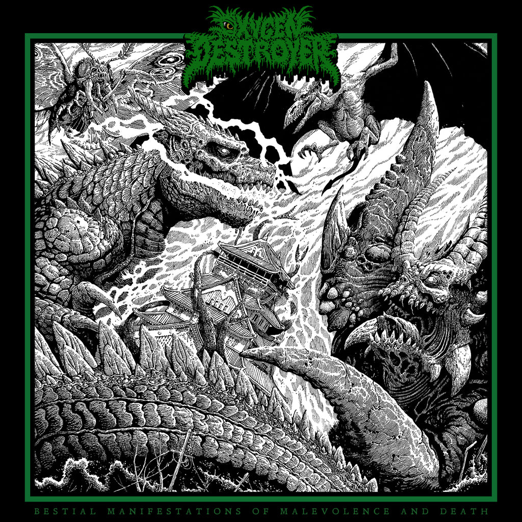 For the first time ever, after being sold out and unavailable for the last 6 years, we are re-issuing Oxygen Destroyer's debut album, Bestial Manifestations of Malevolence and Death, on Atomic Breath Blue vinyl. The artwork has been re-imagined in stunning fashion by Shoggoth Kinetics and this also marks the first release featuring the band's updated logo created by Rohhalusmu Artwork!